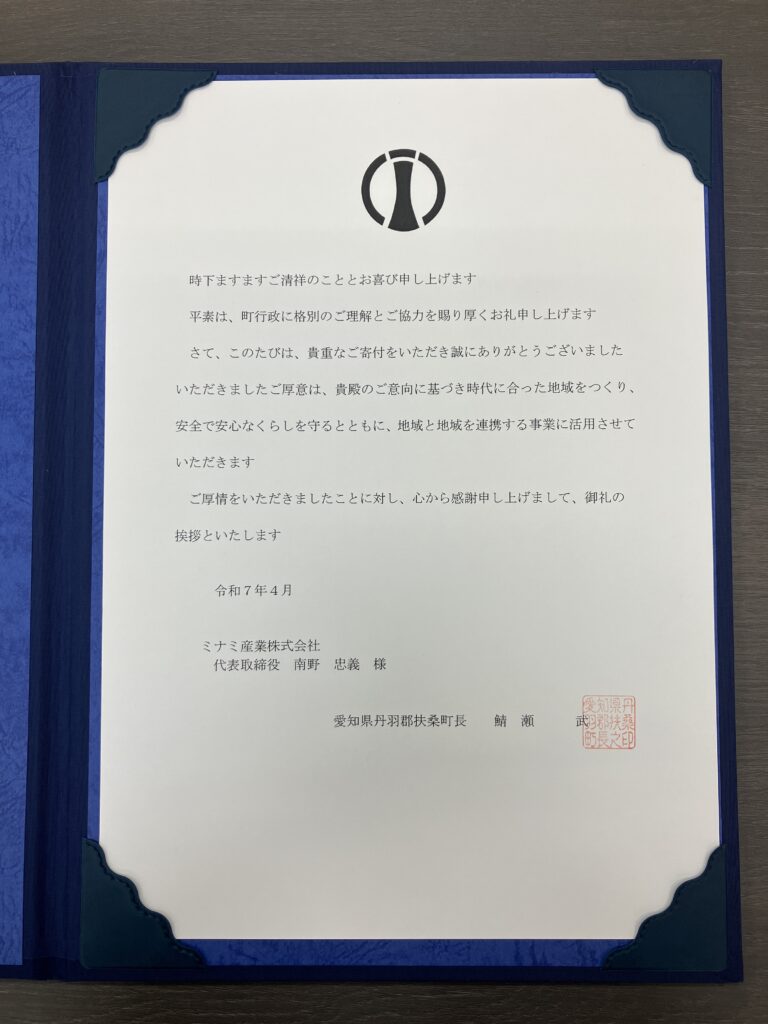 当社のグループ会社であるミナミ産業株式会社では、扶桑町が取り組む「企業版ふるさと納税」事業に賛同し、寄付をさせていただきました。